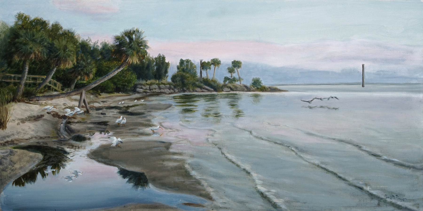 Castaway Tide 12x24 inches oil on canvas panel Florida lagoon shore, at Castaways Point, near dawn, with a still high tide as ibis forage $1000 + shipping, unframed (click photo to return)