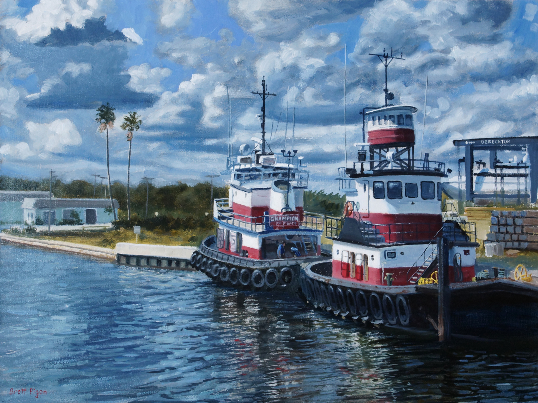 Safe Harbor 18x24 inches oil on wood panel Tugboats shelter in Ft Pierce for hurricane Michael $2000 + shipping, unframed (click photo to return)