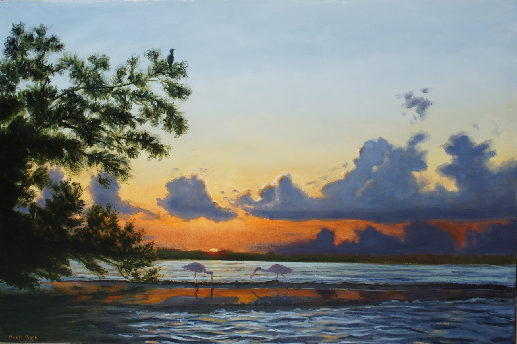 Spoonbills Breakfast 36x24 inches oil on linen Pair of spoonbills forage at a sandbar in the Indian River lagoon spoil islands at sunrise $2400 + shipping, unframed (click photo to return)